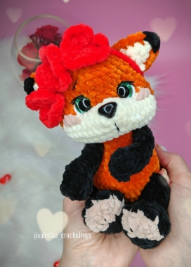 Рост котёнка примерно 25см (зависит от выбранной пряжи, размера спиц и плотности вязания).